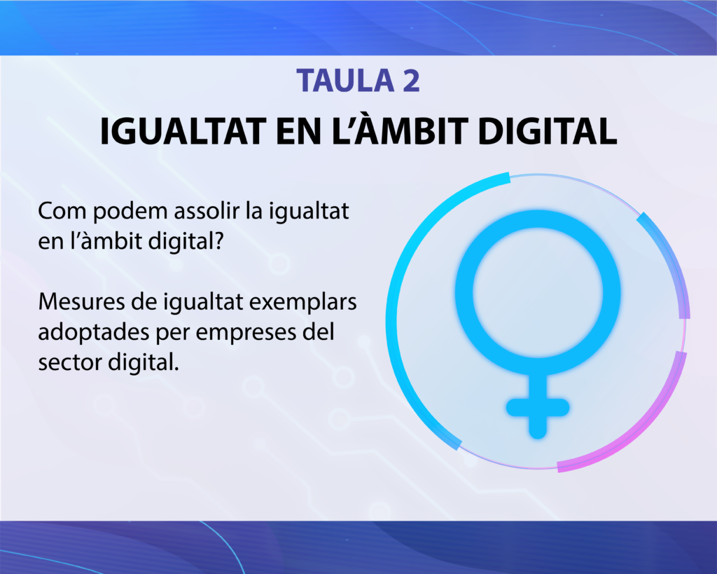 A les 12:00h començarà la segona taula “Igualtat a l’àmbit digital”, en la que es tractaran algunes mesures de igualtat exemplars adoptades por empreses de l’àmbit digital.