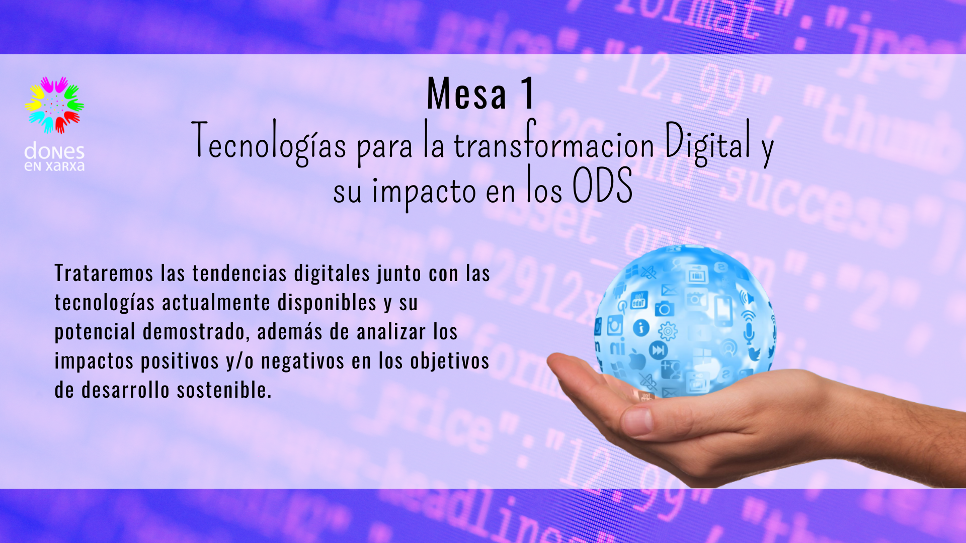A las 11:00h empezará la primera mesa “Tecnologías para la transformación Digital y su impacto en los ODS”, en la que se tratarán las tendencias digitales junto con las tecnologías actualmente disponibles y su potencial demostrado, además de analizar los impactos positivos y/o negativos en los objetivos de desarrollo sostenible.